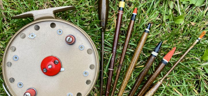 A képen látható úszók egy nottinghami öreg horgász gyűjteményéből kerültek hozzám. Színben a bothoz és az orsóhoz, méretben pedig a vízhez válogattam őket. Testük mahagóni- és aranytölgy-színűre pácolt balsafából készült, száruk pedig (már amelyiknek van) bambuszból.